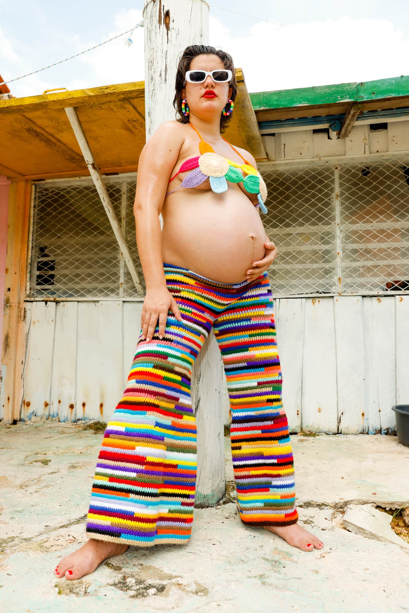 Estos pantalones de ganchillo multicolor se ajustan a tu figura y se abren en la parte inferior para una apariencia única y divertida.