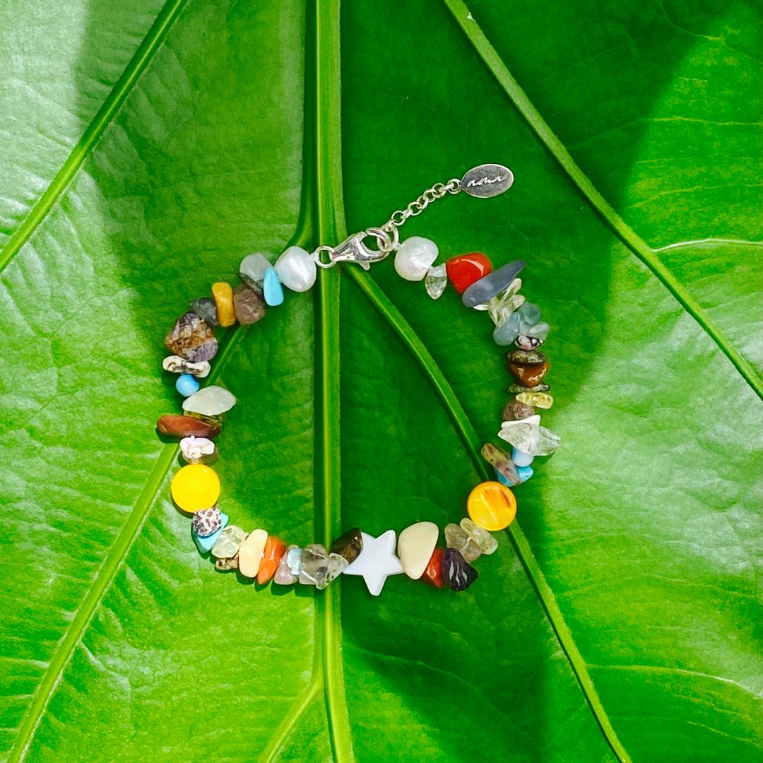 Perlas de cultivo, nácar, cristal, cuarzos y piedras semipreciosas convergen en una pulsera exquisitamente armada con un broche de plata.