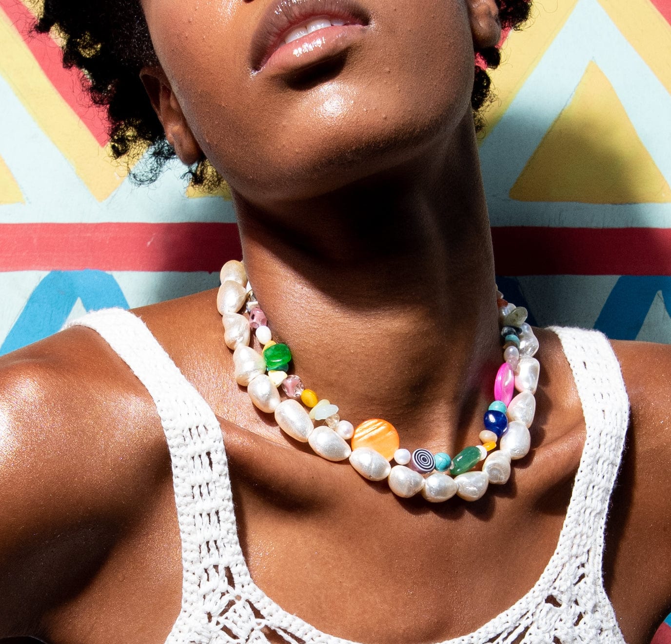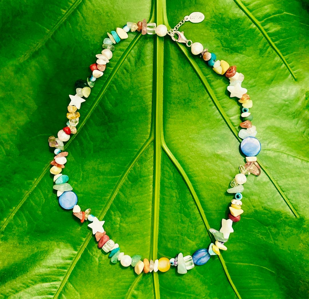 Un collar donde se combina la belleza de las perlas, los destellos relucientes del nácar, el cristal brillante, los cuarzos multicolores y las refinadas piedras semipreciosas enlazadas con un broche de plata.
