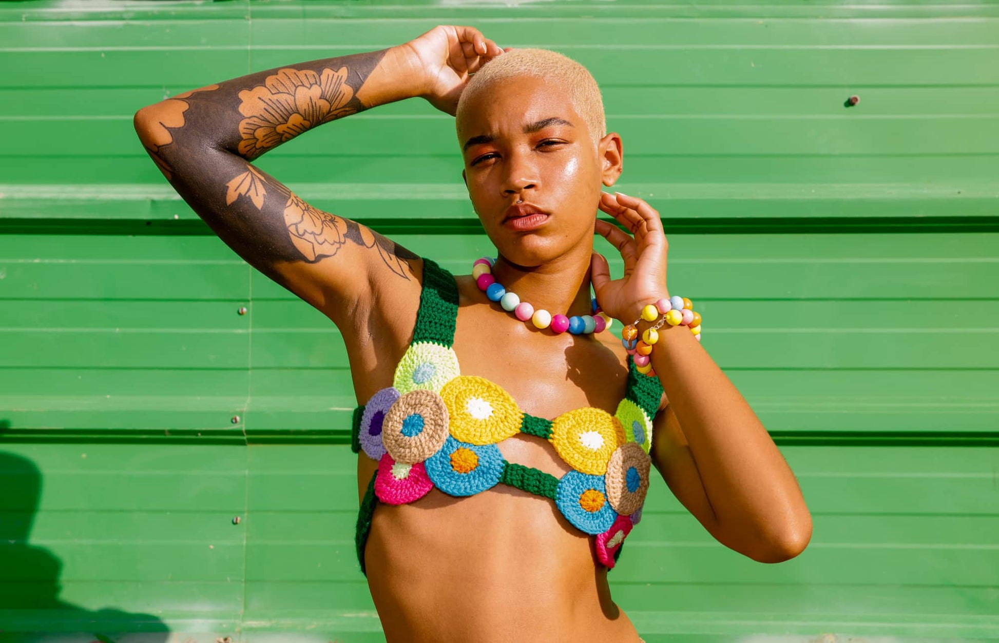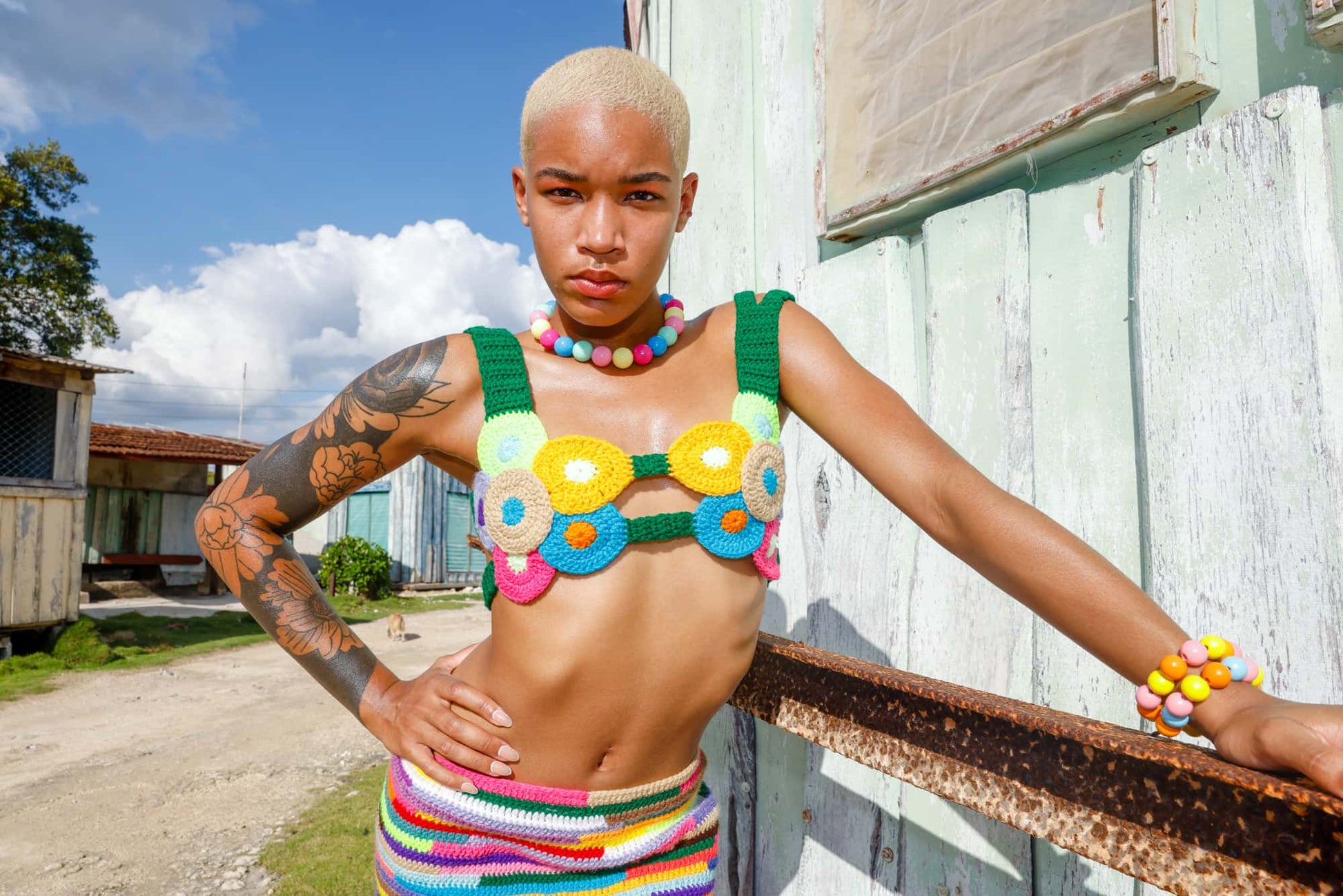 Este top tejido a crochet se transforma en una flor poética de los colores más bonitos: verde, azul, malva, violeta, anaranjado, beige y fucsia.